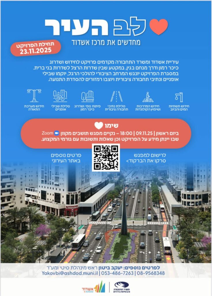 Les travaux s’étendront sur environ deux ans et seront réalisés dans le cadre du projet « La Vague Verte » mené par la municipalité d’Ashdod et le ministère des Transports, dont l’objectif est d’améliorer la continuité des déplacements, de créer des voies de transport en commun fluides, des pistes cyclables et un espace public moderne et aménagé.